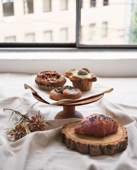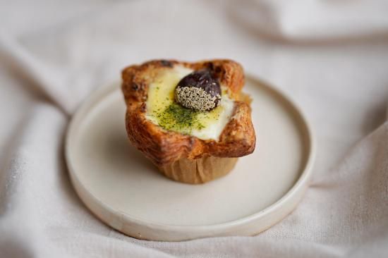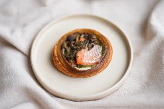 タプナードとは、南フランスプロヴァンス地方発祥のオリーブペーストのことで、クロワッサン生地の上に厚切りサーモンときのこ、爽やかなオリーブかおるバジルソースを合わせたお惣菜デニッシュです。